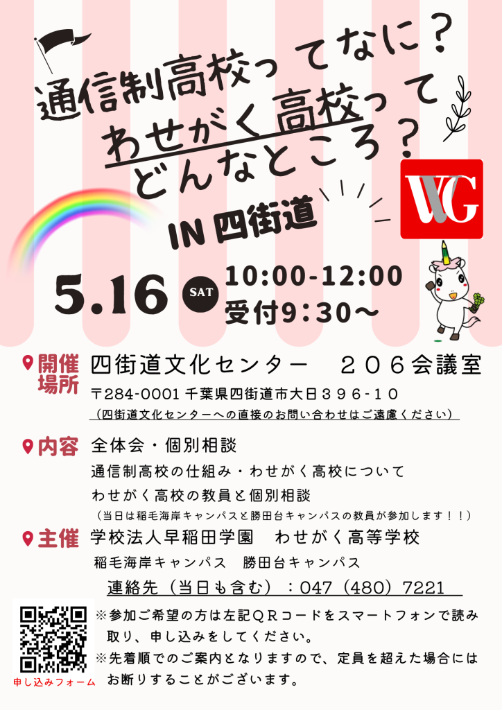 当日は稲毛海岸キャンパスと勝田台キャンパスの職員が参加し、わせがく高等学校での単位の取り方や、両キャンパスの紹介を予定しています。