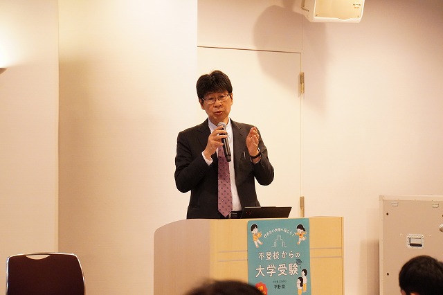 「通信制高校からの大学進学についての基礎知識」の講演では、学びリンク進路アドバイザーの平野稔さんが登壇。通信制高校からの大学進学を考える際、必要な大学受験の基礎知識をご解説いただきました。