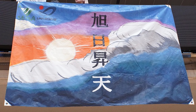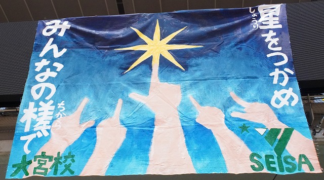 また、各応援席の前にはそれぞれの校舎が制作した「応援旗」が掲げられていました。選手たちを鼓舞するメッセージとデザインで作られた応援旗は、どれもこだわって作られた素晴らしいものばかりでした。