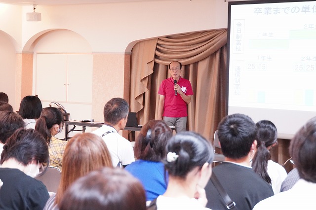 「通信制高校・サポート校のしくみ講演」では、学びリンク代表の山口教雄が通信制高校の卒業条件や通い方、学費などを解説。多くの方に学校選びの前の通信制高校の基本についてお話しました。