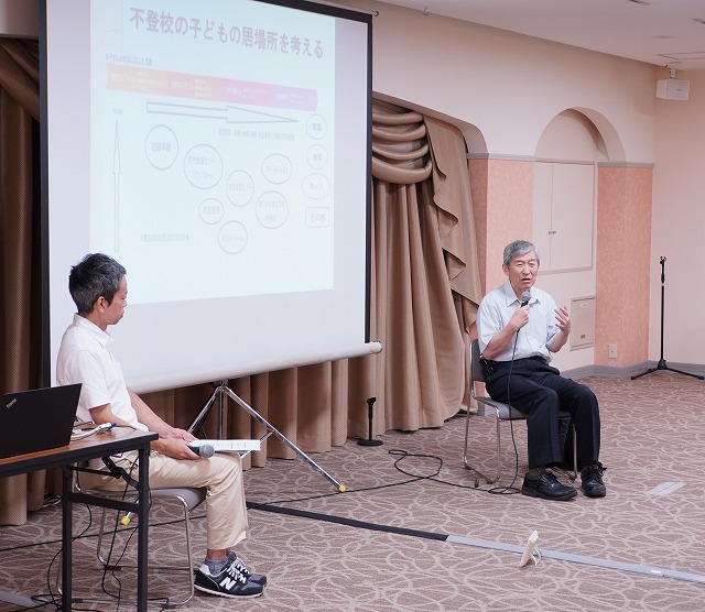 午後からは、西日本新聞編集委員の四宮淳平さんの新刊『「居場所」難民』出版記念の講演が行われました。四宮さんを聞き手に、不登校生支援の会「ぼちぼちの会」会長の木村素也さんが不登校生にとっての安心できる居場所づくりや、進路選択についてお話しました。