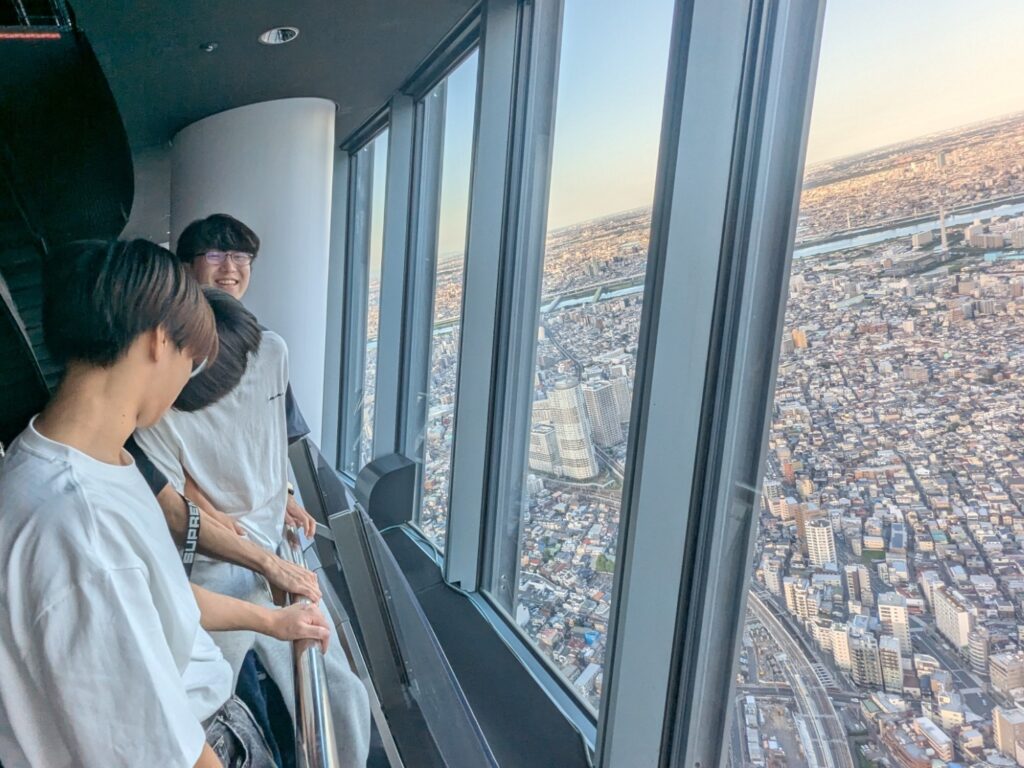 初日は東京駅に到着後、浅草を訪問。仲見世通りで食べ歩きやおみくじを楽しみ、それぞれの時間を満喫しました。その後はスカイツリーへ移動し、晴天の下で東京の街並みを一望。翌日に訪れるディズニーランドの方向を探す姿も見られました。夜は月島のもんじゃストリートで食事。自分で焼く体験に夢中になり、お腹も心も満たされた一日となりました。