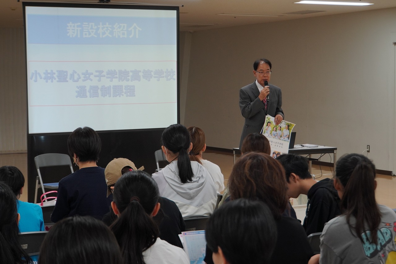 しくみ講演では、通信制高校とサポート校の単位のしくみや卒業に必要な条件などについて説明され、来春開設予定の小林聖心女子学院高等学校 通信制課程による新設校スピーチも行われました。