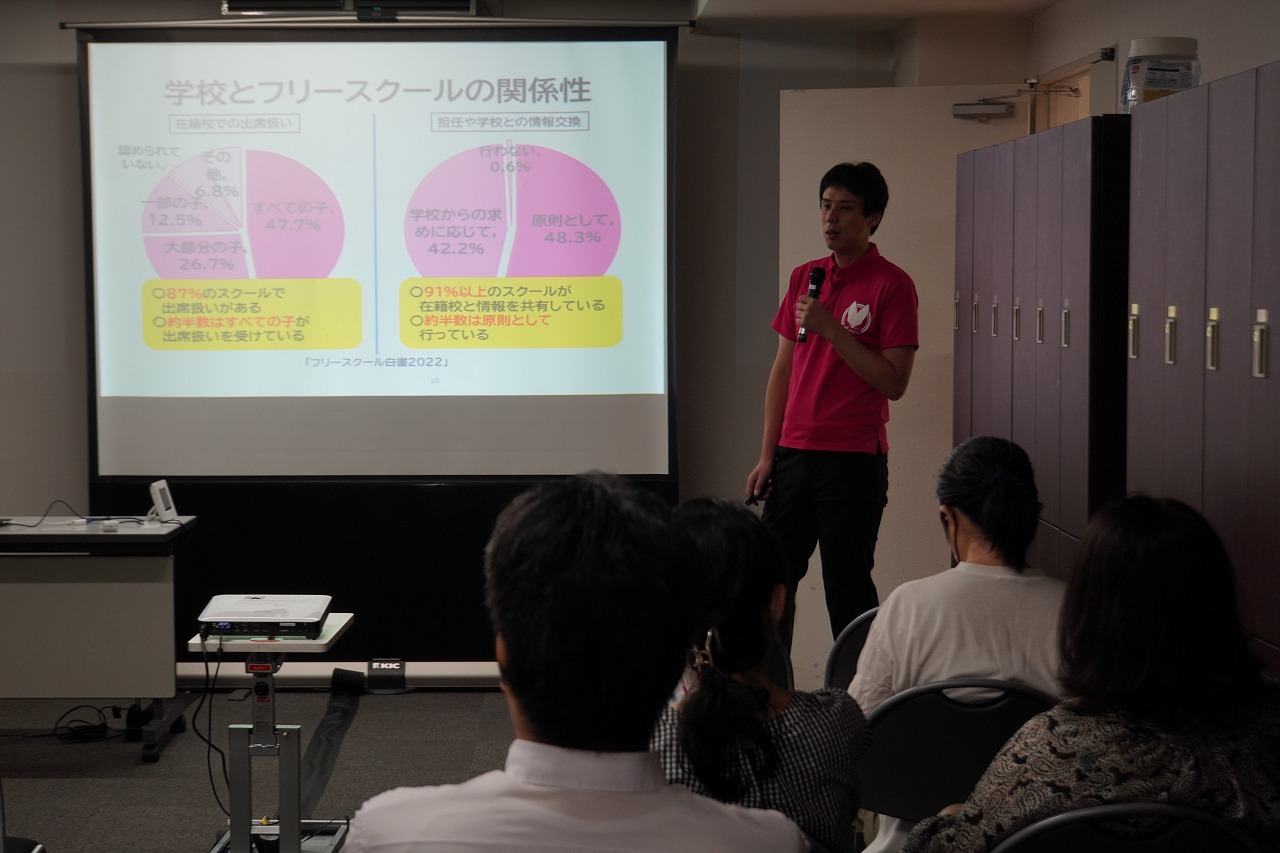 「中等部・フリースクール」に関する講演では、学びリンク編集長・小林建太がフリースクールや通信制高校の中等部に関しての説明を行いました。