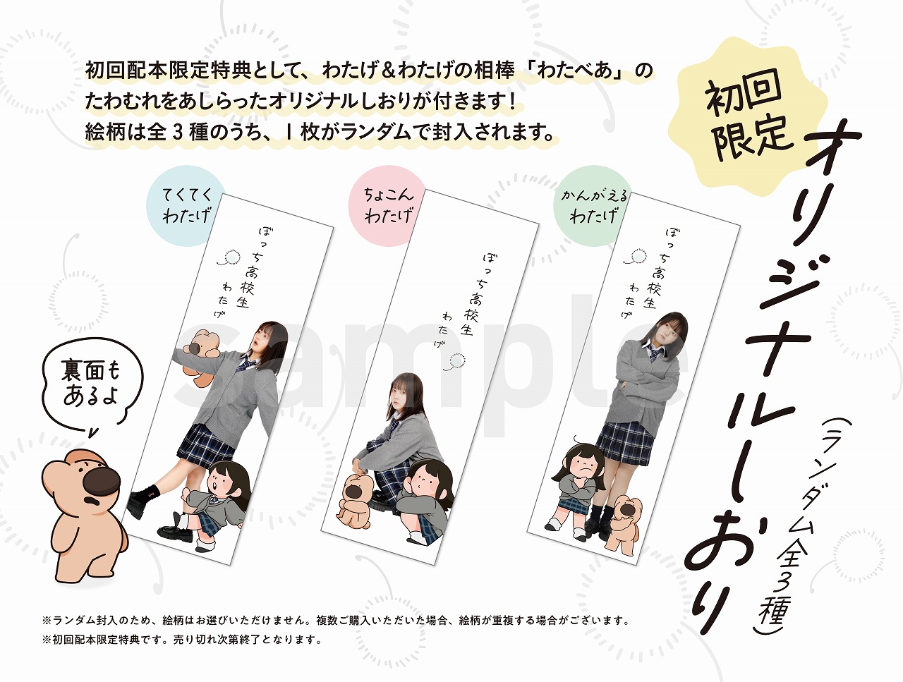 初回配本限定特典として、わたげ&わたげの相棒「わたべあ」のたわむれをあしらったオリジナルしおりが付きます! 絵柄は全3種のうち、1枚がランダムで封入されます。