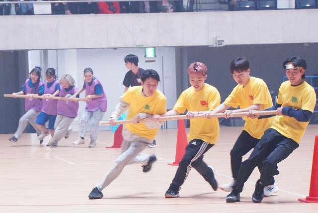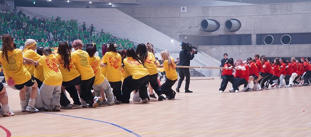 後半は「綱引き」が行われました。会場いっぱいに集まった選手たちが、大きな掛け声をかけながら綱を引く姿は大迫力! スポットライトに照らされながらの決勝戦は、応援にも力が入っていました。