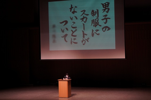 トップバッターをつとめた生徒のスピーチのタイトルは、「男子の制服にスカートがないことについて」。男子の制服にスカートを導入している学校が約27.1%であることや、スカートが女性の衣服となった歴史について触れながら、「男子もスカートの制服を選択できるようにすべき」と結論付けました。