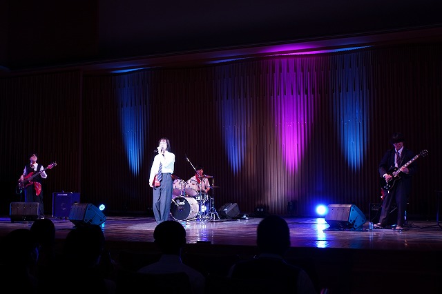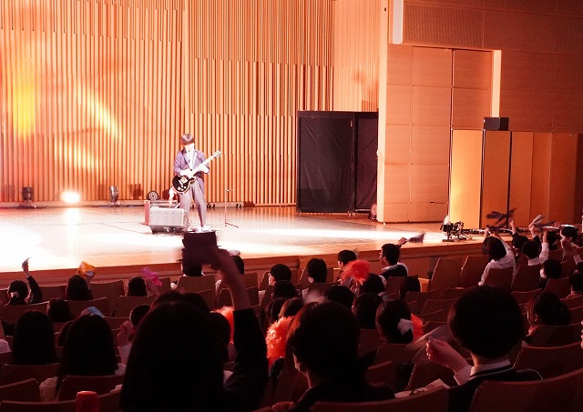 ▲トップバッターを飾ったのは軽音楽部のバンド演奏。いきものがかりの「じょいふる」のカバーでは、観客席の生徒たちがタオルを回し、会場は一体感に包まれました。