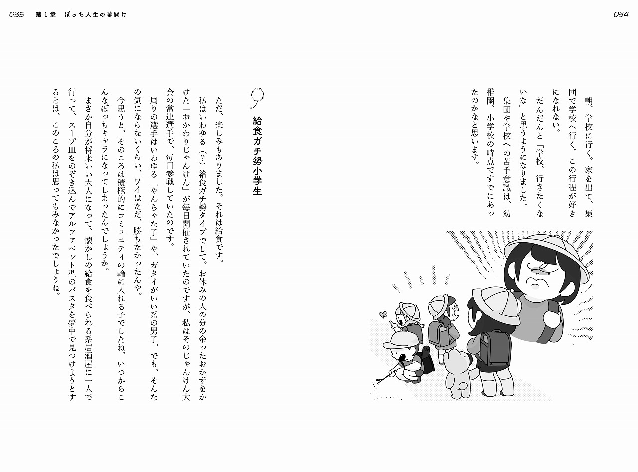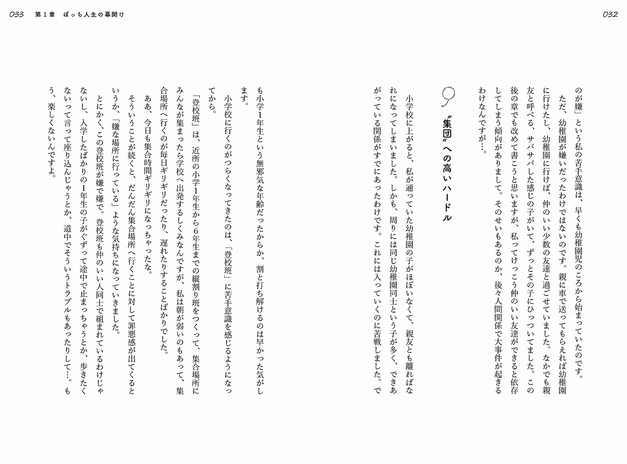 集団になじめなかった幼少期。学校が嫌で仕方なかった中学時代。不登校、学校に行けない罪悪感でいっぱいだった日々。通信制高校への転校。自虐ネタで始めた「ぼっち活」。