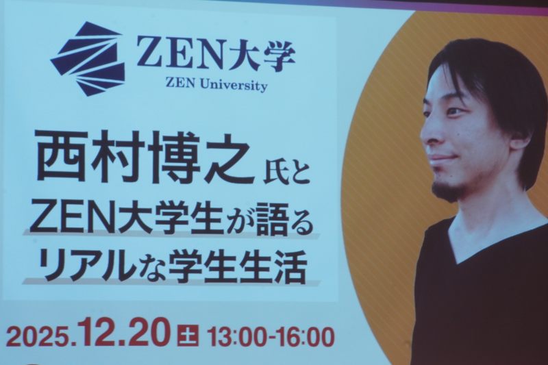 12月20日(土)、学校法人日本財団ドワンゴ学園 ZEN大学(通信制大学)が、オンライン大学への疑問や大学生活のリアルを答えるトークイベントを開催。ZEN大学の在学生4名と、ひろゆきこと西村博之氏が登壇しました。リアル会場とオンラインを合わせて多くの入学検討者や出願済みの方、在学生が集まりました。