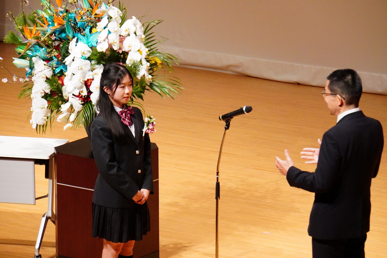 今井校長は、中井さんが入学式で新入生代表挨拶を務めた際の「オリンピックへ出場し、金メダルをとる夢」という言葉にふれ、「見事に有言実行されましたね」と語りかけました。そして、「世界の舞台に立てる喜びを噛みしめて、大いに楽しんでください」と激励しました。
