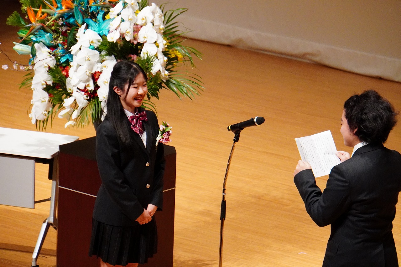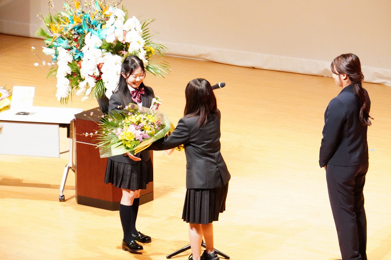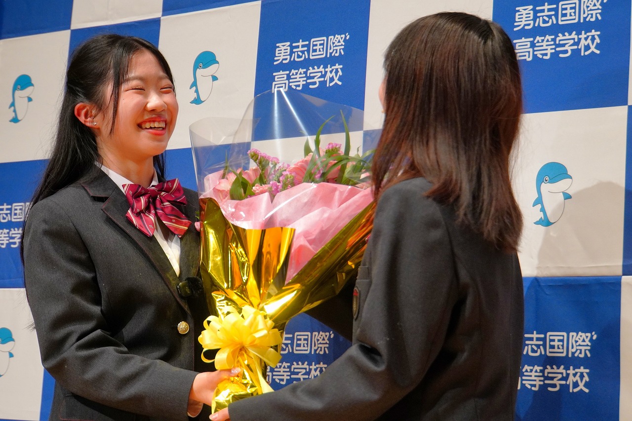 壮行会の中で花束を贈呈した、在校生の寺田栞奈さん、担任の高橋桃子先生の2人から、中井さんの普段の様子を聞きました。