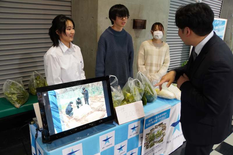 さらに、当日は物販ブースで生徒たちが育てた野菜を販売。一袋200円で春菊・大根・ほうれん草・小松菜・リーフレタスの5種類30袋を準備し、紹介ボードも作成して来場者への呼びかけも行っていました。