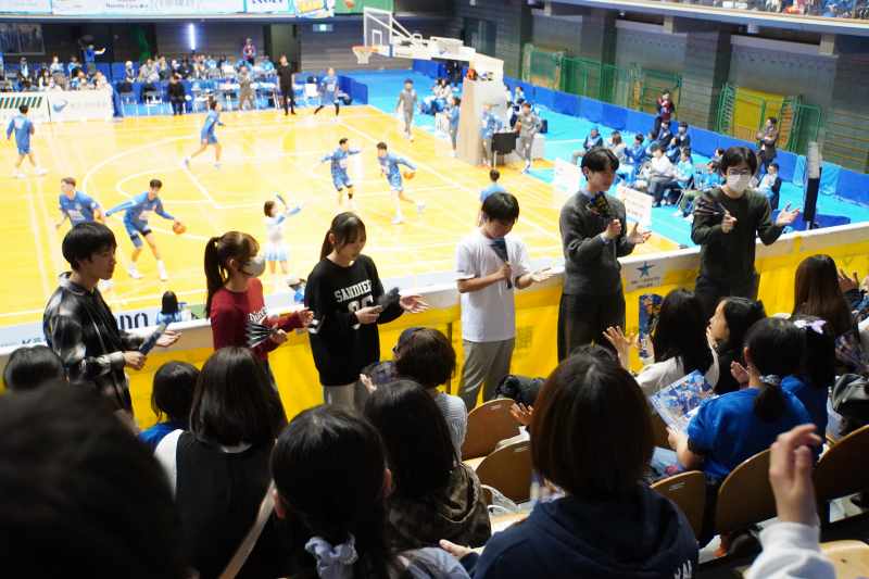 試合は、73-80で惜しくもリーグ2位の香川ファイブアローズに敗れてしまいましたが、楽しそうに応援していた生徒たち。試合を通して得た経験は、生徒たちの進路や経験として非常に大きなものとなったことでしょう。