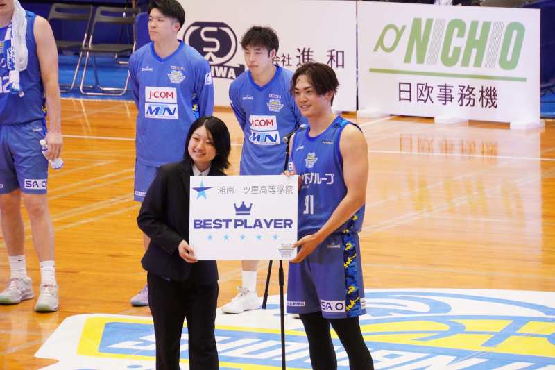 試合後には、カメラマンを務めていた中村さんが湘南一ツ星高等学院からのベストプレイヤー賞を髙木慎哉選手に贈呈。合わせて、中村さんがデザインしたコラボクリアファイルも贈られました。