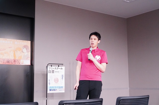 「中等部」に関する講演では、学びリンク編集長の小林建太が、フリースクールの仕組みや特色について解説。講演の最後には、各中等部によるスピーチも行われました。