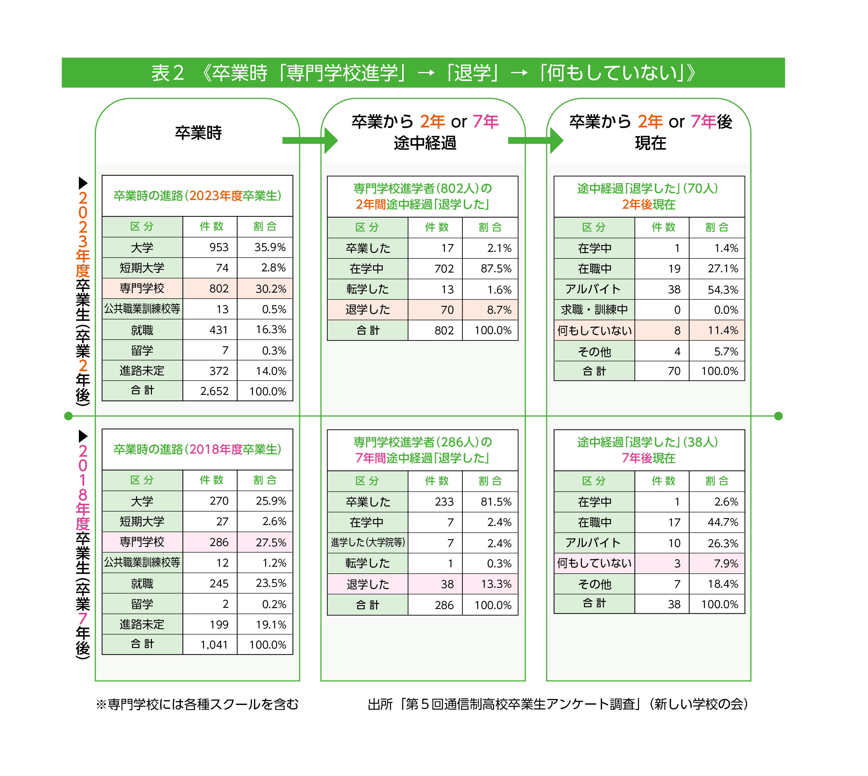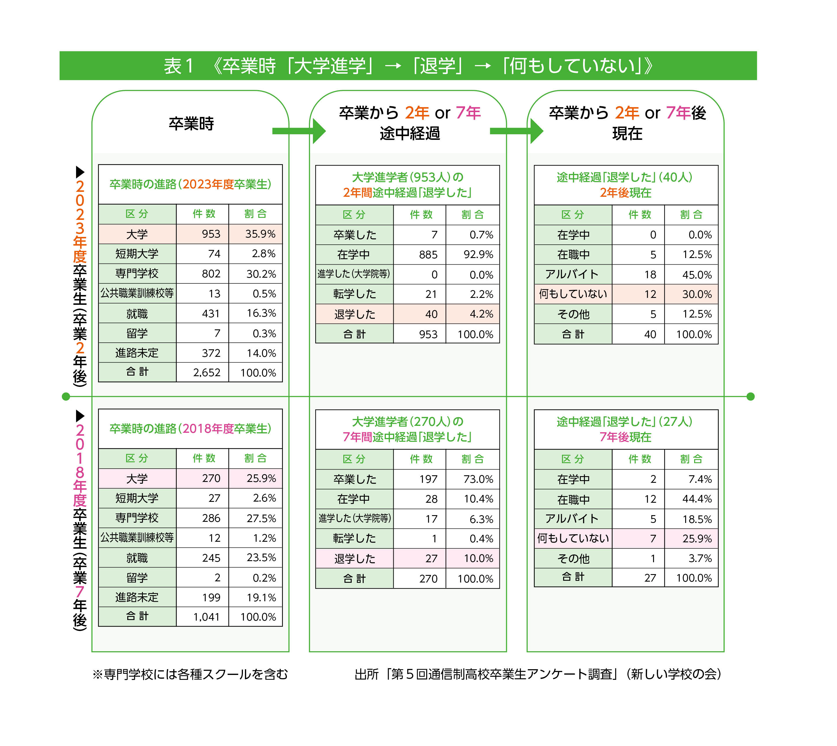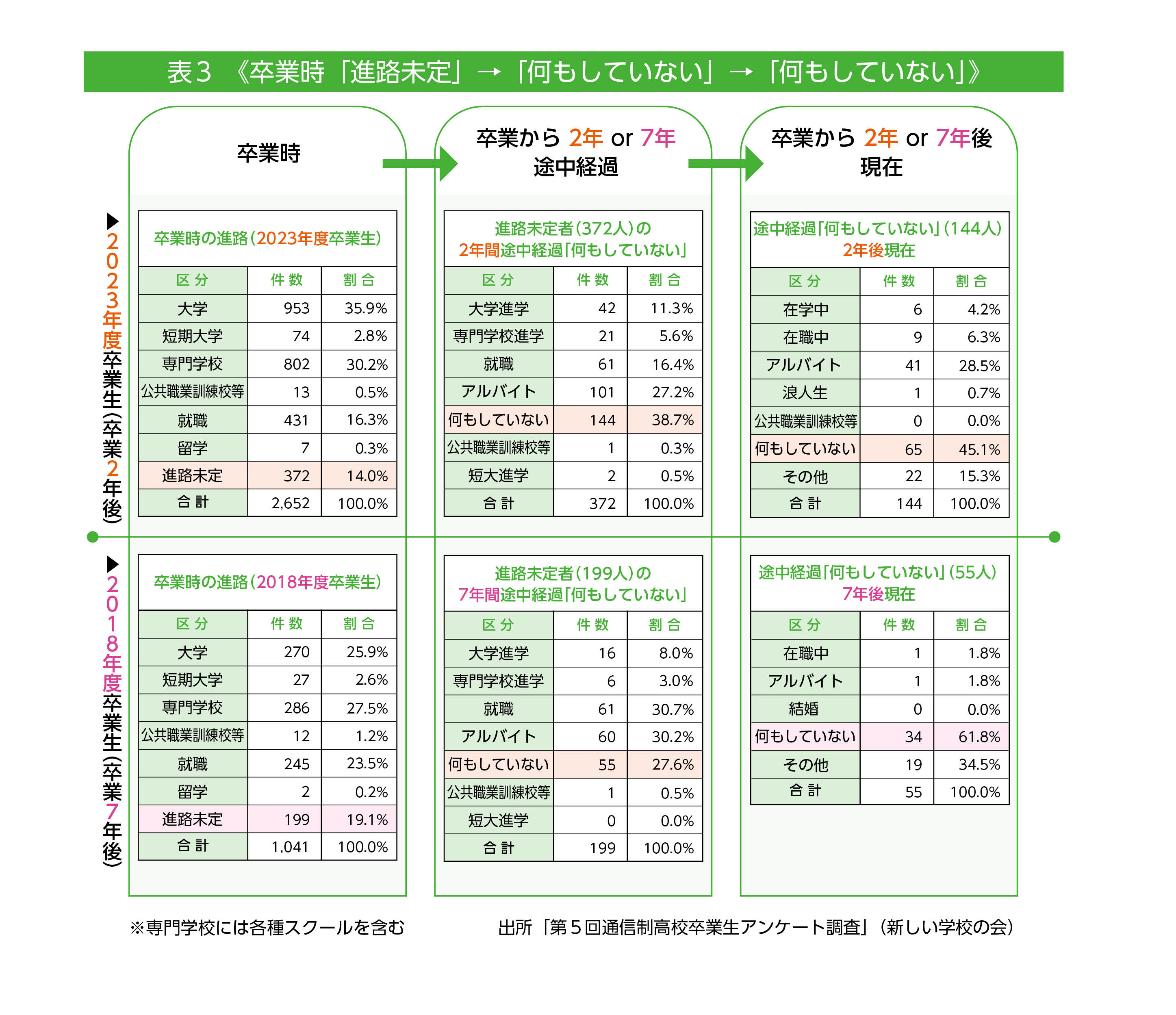 表1から表3は、25年度通信制高校卒業生アンケート調査から卒業2年後・23年度卒業生と7年後・18年度卒業生の2年間ならびに7年間の経過を追っています。今回掲載するのは卒業時「大学進学」「専門学校進学」「進路未定」の2年間経過と7年間経過です。