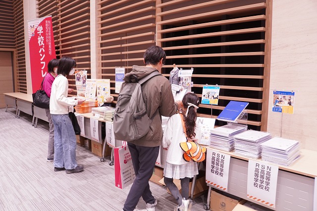 学校パンフレットのコーナーも、自分に合った高校の情報を探す来場者の方で賑わっていました。