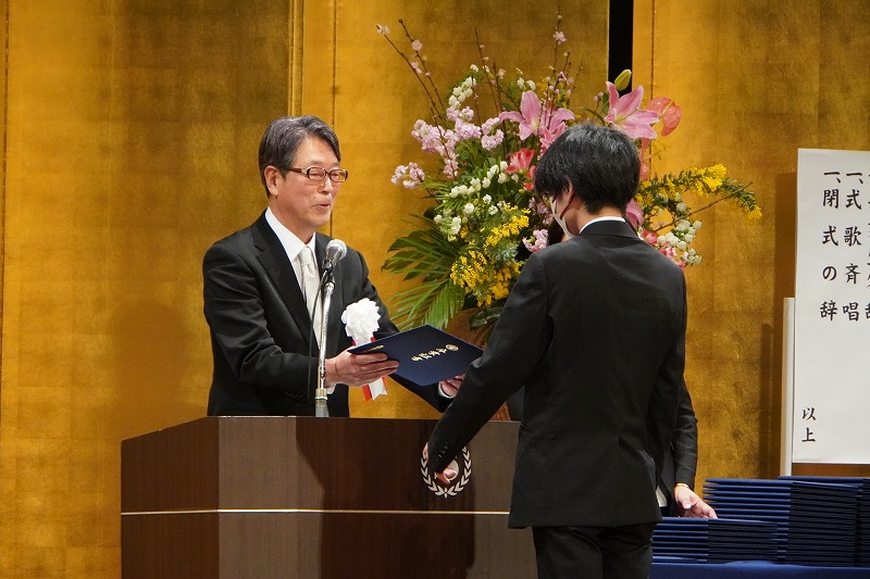 この日、卒業証書を受け取ったのは普通科63名と総合教育学科77名の卒業生たち。式では、一人ひとりが呼名を受け、太田功二校長より直接、卒業証書が手渡されました。呼名の際、担任が一人ひとりの思い出やメッセージを語りかけたほか、スライド上には卒業生一人ひとりの3年間の実績やメッセージも映し出されました。