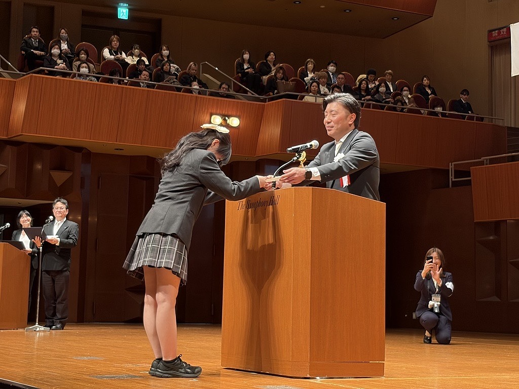 卒業生表彰では、高校生でありながら世界トップクラスのドローンレーサーとして国際大会のレースに出場、輝かしい成績を残し、今後の活躍も期待されている橋本勇希さんが「大阪府私立学校児童・生徒知事賞」を授与し、活躍を讃えられ表彰されました。