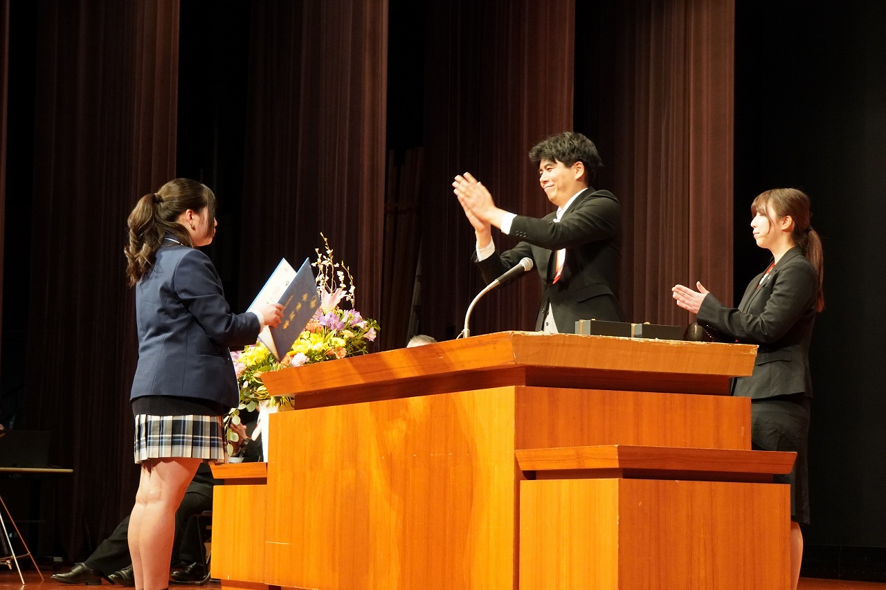 答辞を読んだ卒業生は、会場からの大きな拍手を背に受けながら、酒井学園長と固い握手を交わしていました。