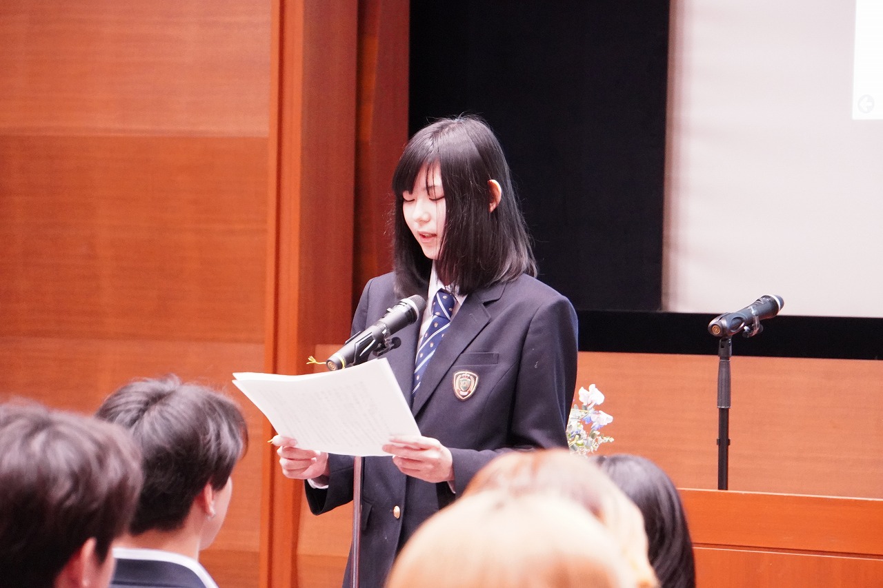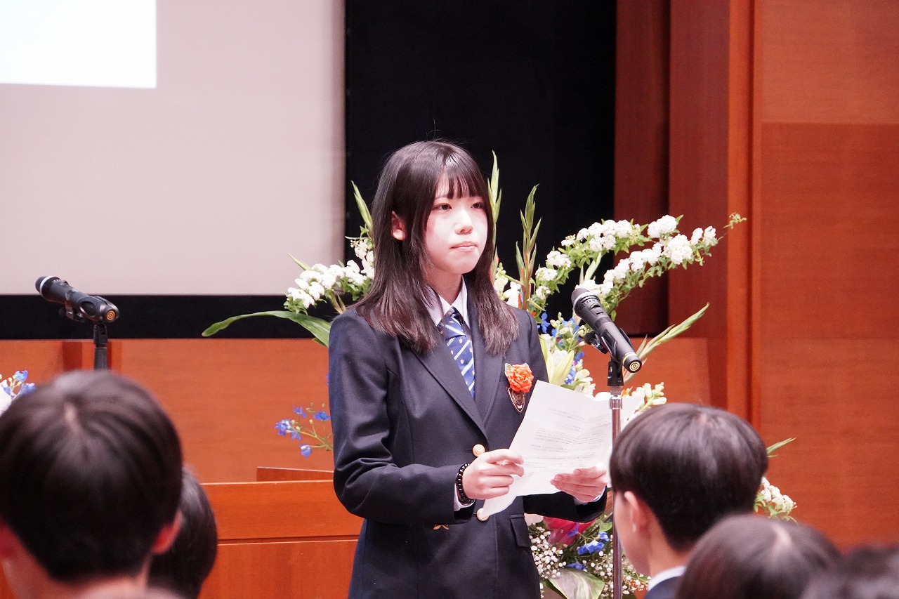 新入生代表の言葉では、2・3年次での海外留学を目指すグローバルコースに入学した代表生徒が「インターネットを通して多くの情報に触れることができる時代ですが、実際に自分の目で見て、感じ、経験することこそ、本当の価値があると考えています。留学を通して様々な経験をし、成長したいです」と抱負を語りました。
