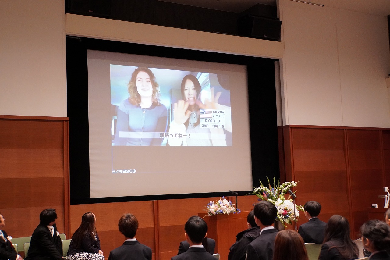 最後に、現在アメリカやカナダに留学中の在校生からお祝いのビデオメッセージが届けられました。現地のクラスメイトと一緒に歓迎の言葉を送る生徒も見られ、留学先での友人と打ち解けた交流がなされている様子が感じられました。
