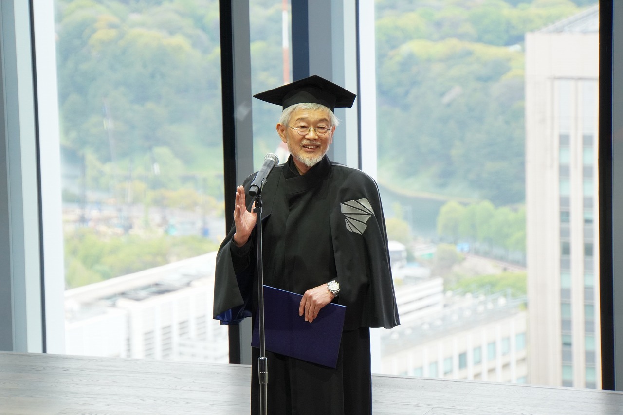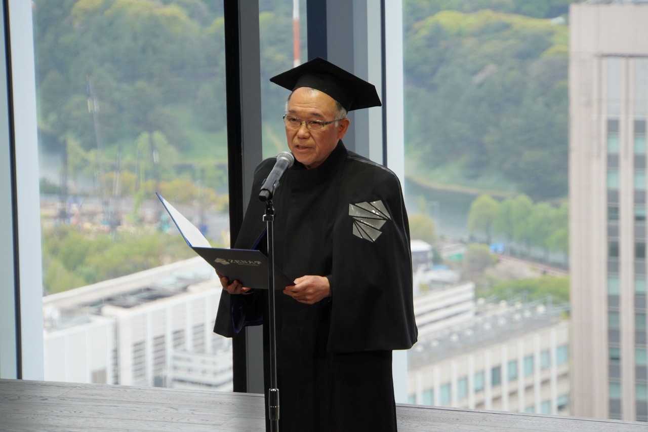 学長式辞を読んだ若山正人氏は、「ZEN大学は、オンラインだからデジタルなのではありません。そもそも言葉とは、文字を組み合わせたデジタル表現です。先端技術を使いながら、言葉というデジタル表現によって、いかに心に響き合う形で意思や考えを共有できるかが、時代を超えて重要です」とその意義を強調。そして、「思考の幹となる知識にとどまらず、広い視野の獲得を心がけてほしい」と訴えました。