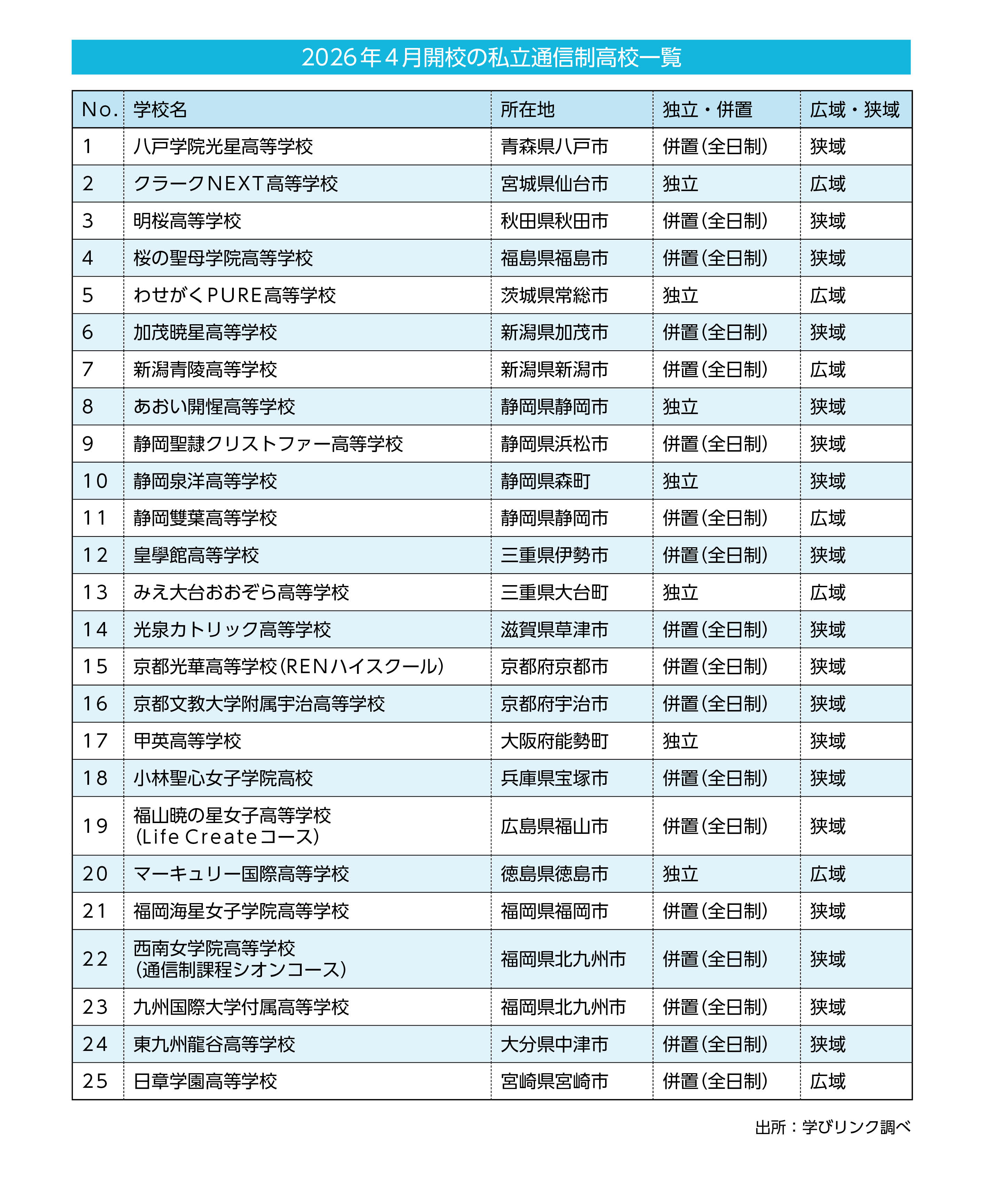 私立通信制高校新設25校を見ると、広域・狭域校の内訳では広域校7校(内訳28%)、狭域校18校(同72%)と狭域校主体となっています。これは独立・併置校の内訳にも通じ、独立校7校(同28%)、併置校18校(同72%)となっています。狭域・併置校が数の上では新設校の中心となっています。