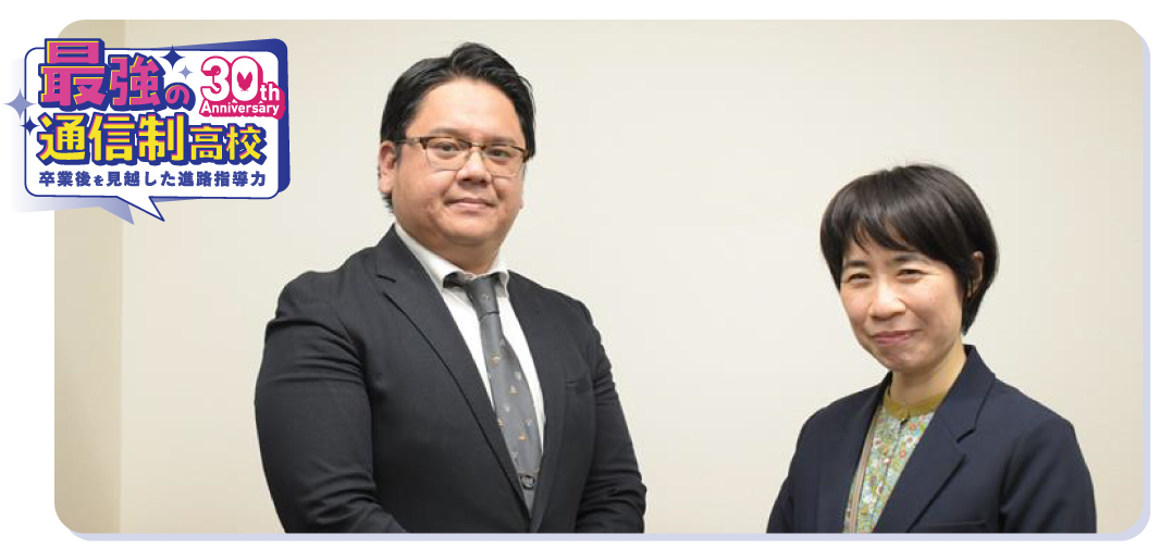 つくば開成福岡高校の進路指導は、「10年後を見据えた自分づくり」を重視して行われています。高校卒業をゴールとするのではなく、社会に出た時にどんな自分で在りたいのか。そんな同校の進路指導について、進路指導を担当する村中善司先生(左)と中尾恭子先生(右)に伺いました。