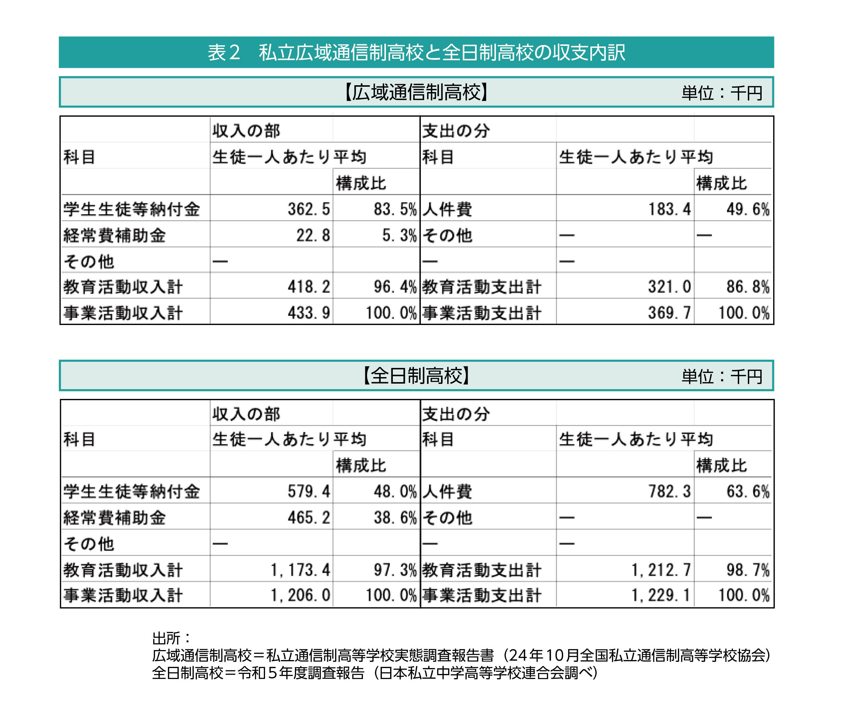 経常費等補助金額は、生徒1人当たり換算で広域私立通信制高校22,800円、私立全日制高校で465,200円と約20倍の開きがあります。