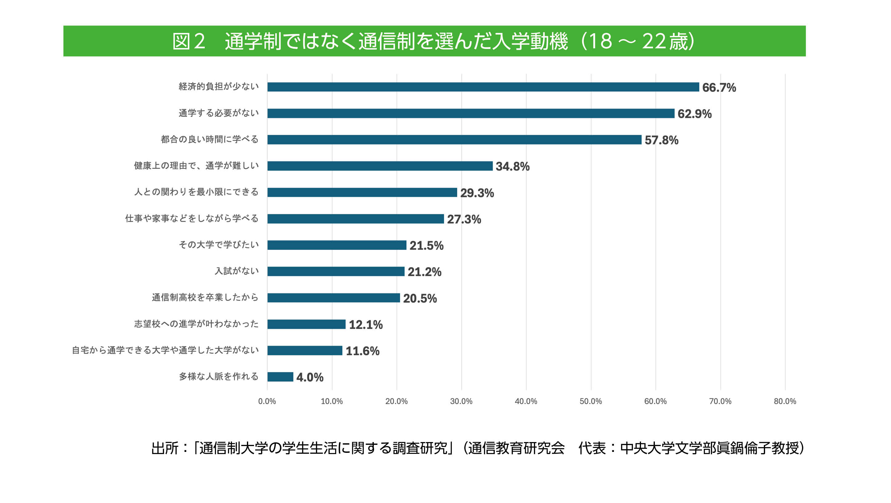 図2の18歳から22歳の通信制大学を選んだ入学動機を見ると、「通学する必要がない」「都合の良い時間に学べる」「健康上の理由で、通学が難しい」など通信制高校選択理由と同様なものをはじめ、ズバリ「通信制高校を卒業したから」というものもあります。